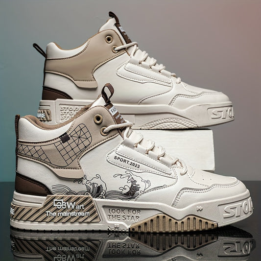 1pair Men'S Fashion Skateboarding Sneakers, High-Top Midsole with Lace-Up Closure, Faux Upper, Cartoon Wave Pattern, Comfortable Non-Slip PVC Sole, Breathable Fabric Lining, Casual Street Style Shoes for Outdoor Activities