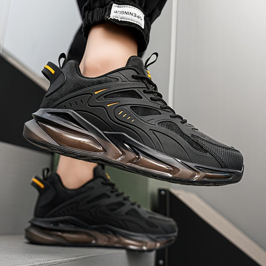 Men's Casual Sneakers - Breathable Low-Top Lace-Up Design, Durable PU Upper Cushioned PVC Sole for All-Season Comfort - Black with Yellow Accents - Ideal for Running, Hiking, Daily Wear, Hiking Footwear, Stylish Contrast Ac