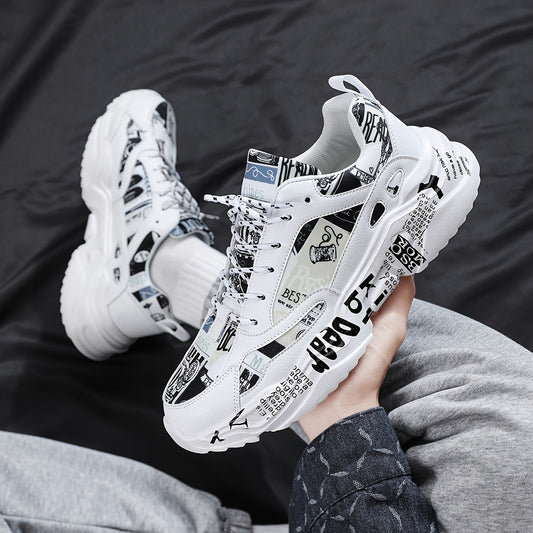 Men'S Fashion Trend Heightening Random Graffiti Contrast Color Letter Stickers Dad Shoes, Comfortable Daily Versatile Casual Large Size Running Shoes Couple Sports Shoes