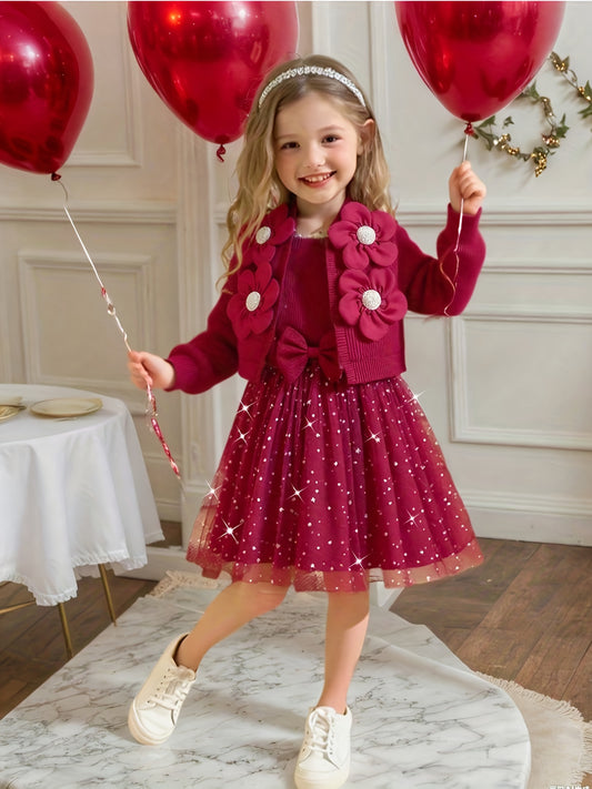 Young Girl Fashion Short Waffle Knit 3D Floral Jacket Top Solid Color Ribbed Vest with Bow Patchwork Mesh Dress Set for Daily Home Outdoor Sports Spring and Autumn, Perfect for Outdoor, Girl Dresses, Girl Clothes, Girl Outfit