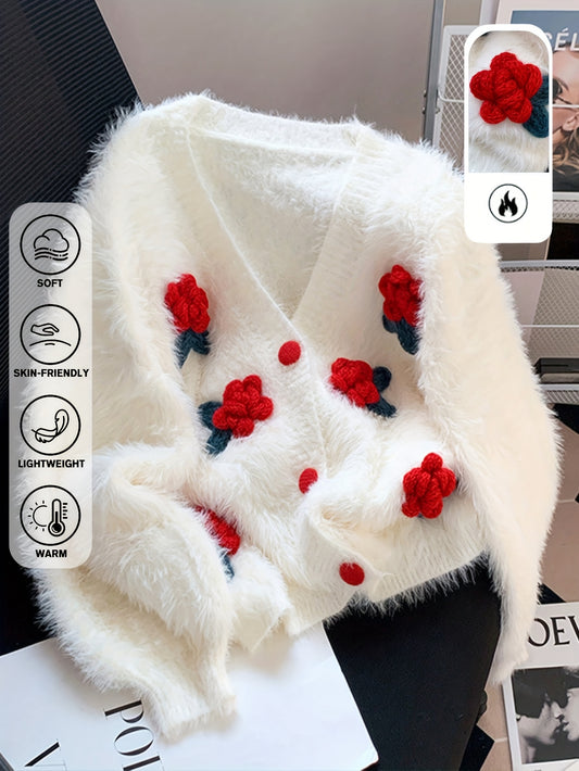 Women'S Vintage Floral Cardigan Sweater - Soft Fuzzy V-Neck Button-Front Closure, Elegant & Red Floral Pattern with Accents, Casual To Formal Outerwear For Fall/winter, Sweater Cardigan, Winter Layering, Fall Fashion, Stylish