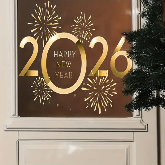 1pc Golden Number 2026 & Fireworks New Year Window Decoration - Double-Sided PVC Self-Adhesive Glossy Rectangular Sticker, Mixed Colors, Single Use, for Christmas Home