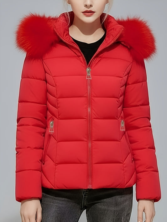 Women'S Red Winter Hooded Jacket with Plush Faux Fur Trim - Cozy Long Sleeve Zip-Up Coat, Slim Fit Casual Outerwear, Side Pockets, Warm & Stylish for Fall/Winter, Winter Jacket, Fall Fashion, Elegant Design, Soft Texture, Fas