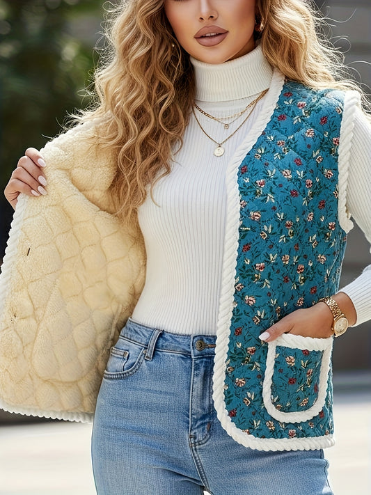 Women'S Vintage Floral Sleeveless Vest - Red & Blue Floral Pattern with White Trim, Cozy Fleece-Lined Lining, V-Neck Casual Jacket for Fall/Winter