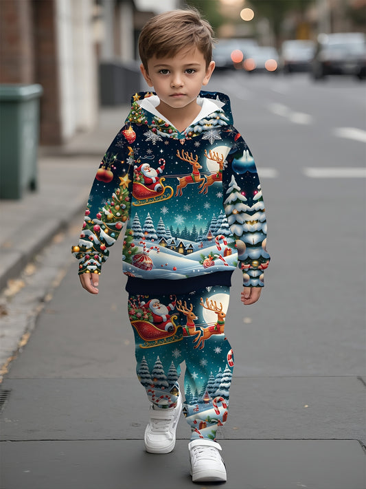 Boys' Digital Print Hooded Sweatshirt and Sweatpants Set - Christmas Hooded Pullover and Long Pants Two-Piece Set, Perfect for Outdoor