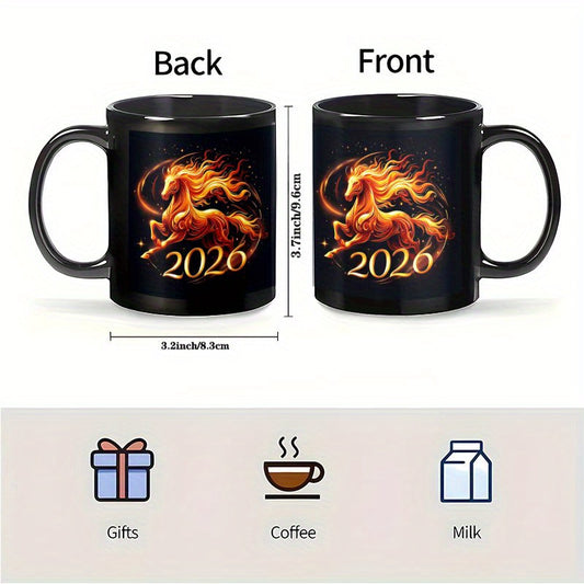 1pc 11oz Chinese New Year of the Horse 2026 Ceramic Mug - Glossy Black & Fire Horse Design Coffee Cup with Auspicious Red/ Horses, Hand Wash Only, Reusable Gift for Home, Office, Travel, Lunar New Year Celebrations