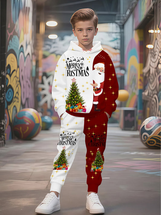 Boys' Hooded Sweatshirt Set, Red and White Color Block Design with Santa, Christmas Tree, and Gift Prints, Festive Style for Christmas Season, Suitable for Sporty and Trendy Kids' Casual Wear, Perfect for Outdoor