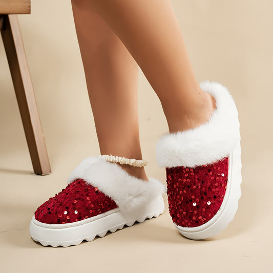 Women's Red Slippers with Red Dress Print - Winter Warm Soft Sole Slip-On Moccasins Suitable for Winter Parties, Christmas & New Year's Eve - Comfortable /Outdoor Footwear, European Style Fabric Upper & TPR Sole