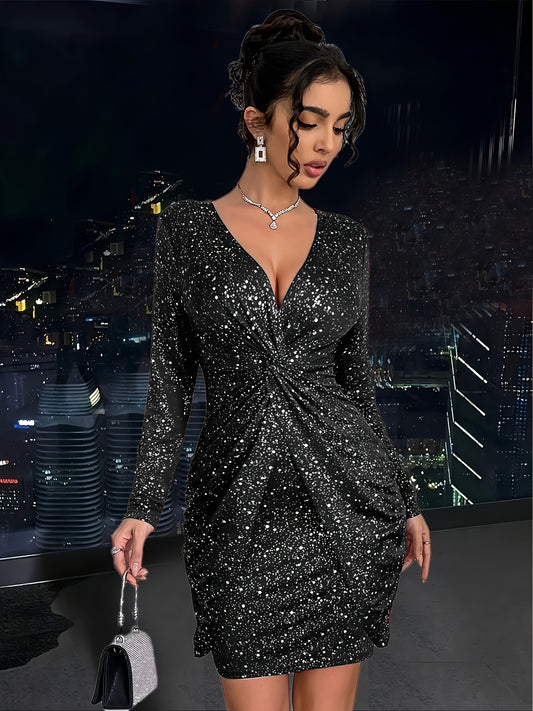 Women'S Elegant V-Neck Long Sleeve Dress with Twist Detail - Sparkling Party & Formal Dress, Stretchy Fitted Fabric, Flattering Bodycon Silhouette for Evening Events, Office, Wedding - Spring/Fall/Summer Fashion, Cute Dresses