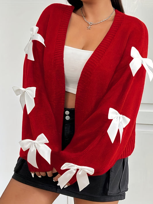 Plus Size - Women'S Casual V-Neck Cardigan with Playful Bow Details - Red, Long Sleeve, Button-Up Front, Lightweight & Breathable for Spring/Fall, Perfect for Casual Attire or Vacation Style, Spring Outerwear | Vneck Design |