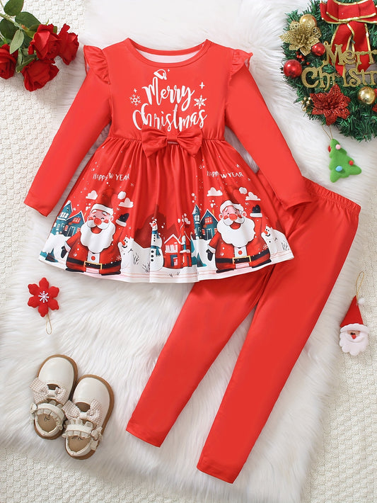 Girls' Two-Piece Set: Fashionable Solid Color Round Neck Short Sleeve Christmas New Year Style Print Ruffled Hem Long Sleeve Top + Solid Color Tight Pants, Perfect for Outdoor Activities, for Outdoor