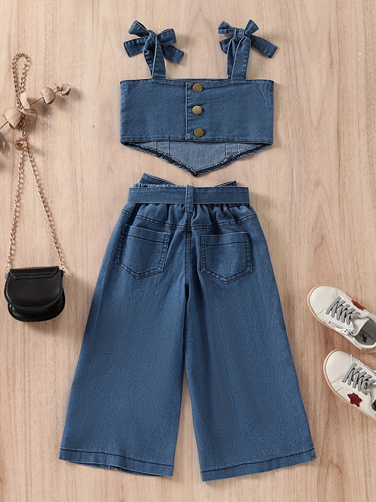 Relaxed Fit, Chic Girls' Denim Outfit Set - Sleeveless Crop Top & High-Waist Slit Pants with Belt, Cotton Blend, Machine Washable, Perfect for Outdoor