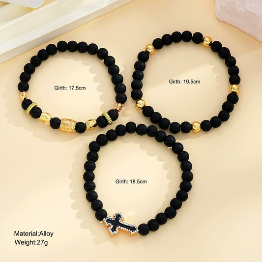 A Set of Three Men'S Bracelets Featuring Black Beads And Cross Decorations, Perfect for Mature Men. These Accessories Are Suitable for Everyday Wear And Make Great Gifts for Men.