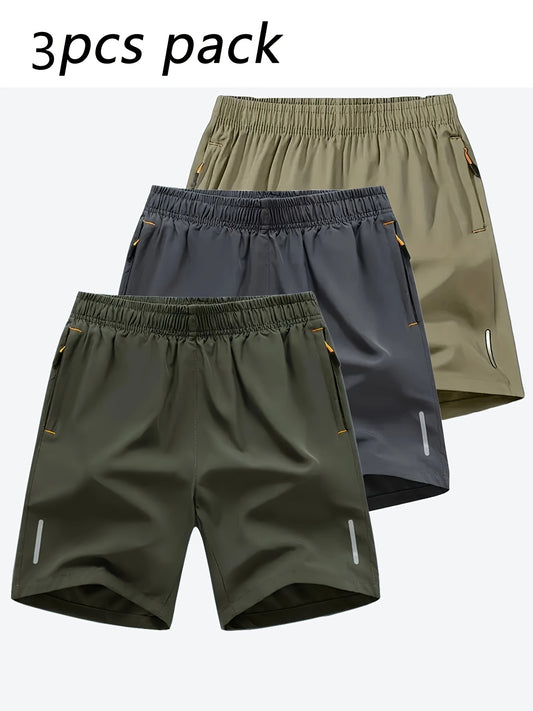 3pcs Men's Athletic Shorts, Breathable Quick-Dry Polyester with Zipper Pockets and Drawstring, Solid Color Sports Style for Running & Workout, Mid Waist Regular Fit
