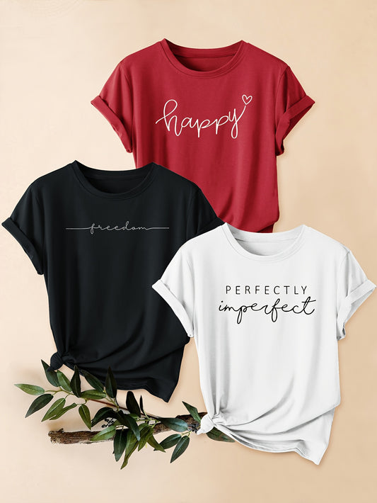 3pcs Women'S Vintage-Inspired T-Shirts with "Happy" & "Freedom" Prints - Casual Short Sleeve Crew Neck Tees in Red, Black, & White - Soft Stretchy Fabric for Spring/Summer/Fall - Perfect for Casual Attire, Versatile Clothing