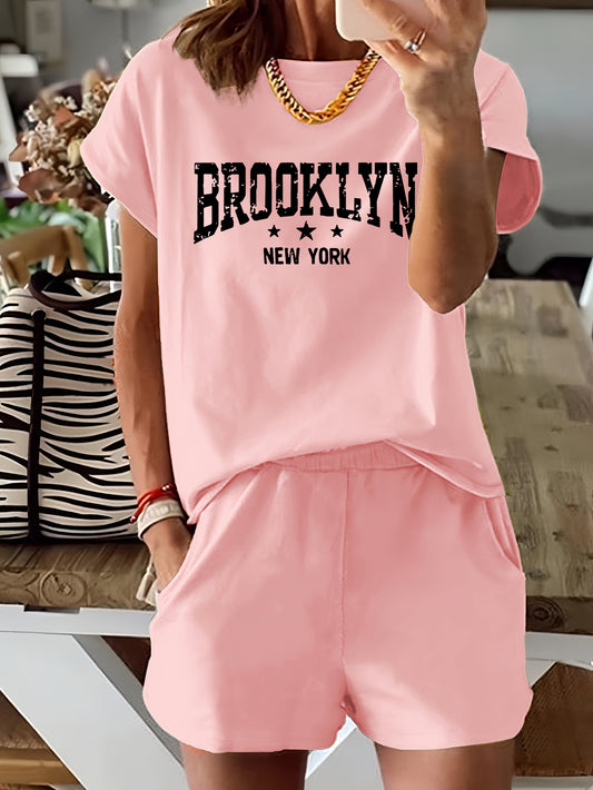 Brooklyn Letter Print Casual T-Shirt & Shorts Set for Women - Stretchy Polyester Blend, Machine Washable