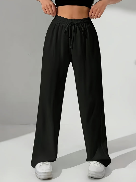Women's Comfortable High-Waist Drawstring Wide-Leg Pants - Soft Polyester, Black, Relaxed Fit, Machine Washable, Casual Style for Casual Attire, Everyday Comfortable Wear | Relaxed Fit Pants | Glossy Finish