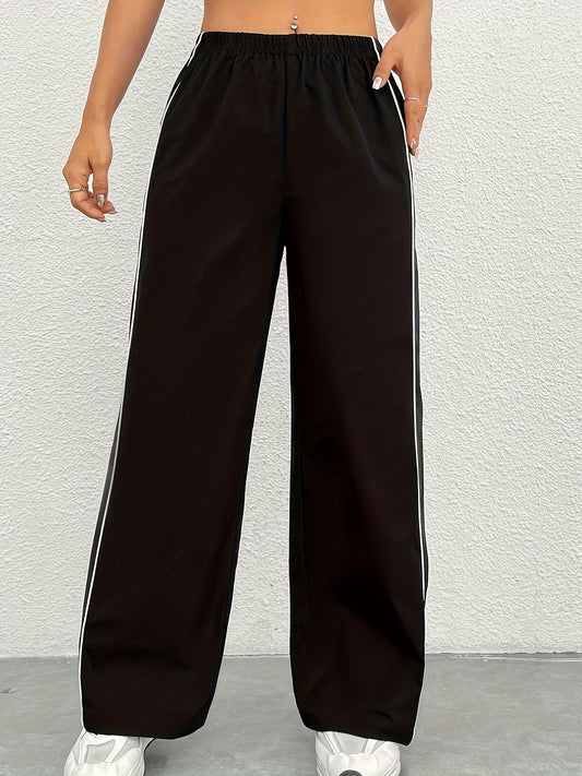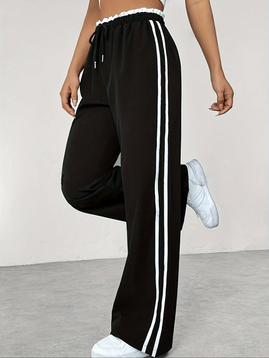 Women's Stylish Black & White Side Stripe Straight-Leg Joggers - 100% Polyester, Machine Washable, All-Season Casual Athletic Pants for Adults