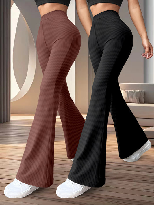 2-Pack Women'S High Waist Flare Leg Pants, Casual Stretchy Yoga Sports Trousers, 96% Polyester 4% Spandex, All-Season Knit Fabric, Solid Color Long Length Pants for Women