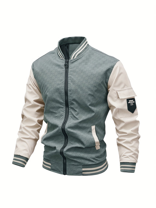 Men's Vintage Baseball Jacket - Lightweight Zip-Up Coat with Dark green/Beige colorblock, Non-Stretch Fabric for Casual & Formal Outfits - Spring/Fall Outerwear Jacket, Outdoor Wear, Retro Fashion, Durable Construction, Styli