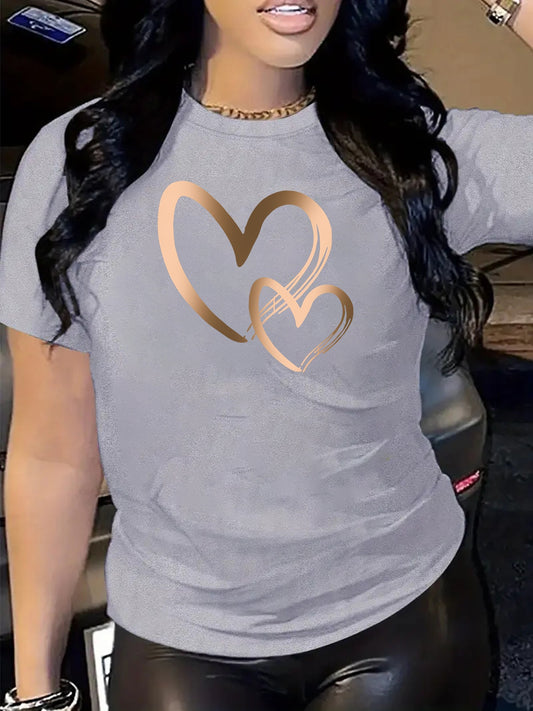 Women'S Heart Graphic T-Shirt - Short Sleeve, Crew Neck, Stretchy Polyester, Casual Spring/Summer Top with Golden Heart Design, Comfortable Clothing | Heart Pattern Shirt | Nontransparent Material