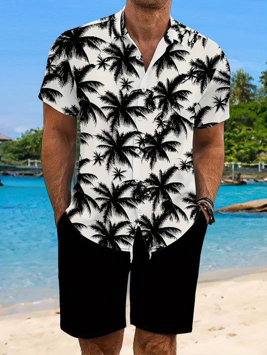 Men's Casual Summer Shirt Set, Black Palm Tree Pattern 3D Print, Loose Collar Short Sleeve Shirt and Drawstring Shorts 2pcs Set