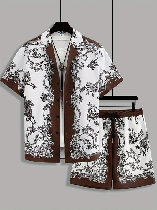 Men's Summer Suit Set: Short Sleeve Knight Print Positioning Burned Shirt with Open Collar, Drawstring Casual Shorts Pajama Two-Piece Set