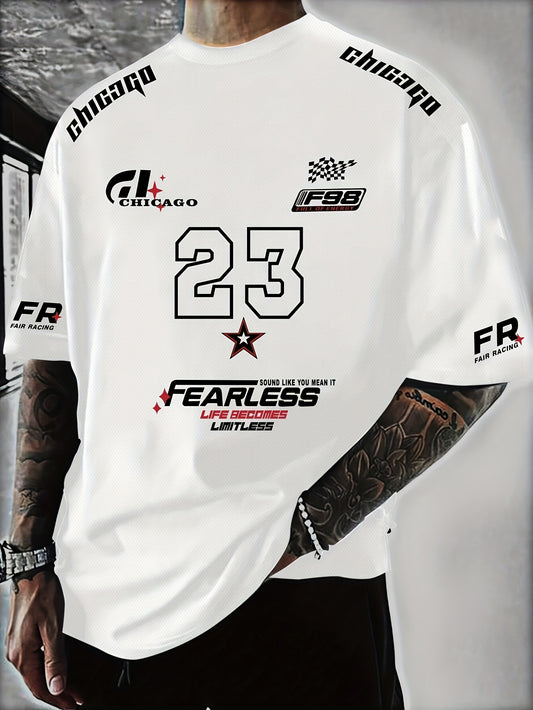A Men'S Racing Icon #23 3D Print Short-Sleeve T-Shirt - Casual Streetwear, Breathable Sportswear, Round Neck, Summer Fashion Top, Unique Letter Print Design, Made of 100% Polyester, Slightly Stretchy Knitted Fabric, Suitable