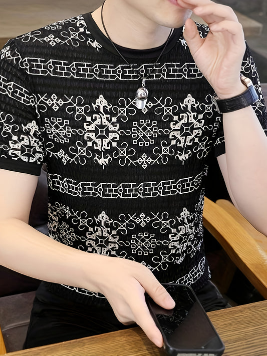 Men'S Slim Fit Breathable T-Shirt with Intricate Black White Geometric Print - Moisture-Wicking Polyester-Spandex Blend, Machine Washable, Round Neck Short Sleeve for Summer Casual Wear, Gym, Hiking Outdoor Activities