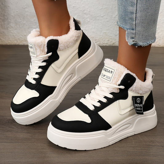 Women's Plush Fleece-Lined High-Top Sneakers - Thick-Soled Winter Warm Lace-Up Shoes with PU Upper & Cushioned PVC Sole, White/Black/Grey Chunky Dad Shoes (Cozy Round Toe) - Instagram Trendy Winter Footwear by I Trend