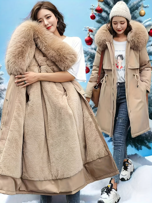 Women's Winter Elegant Solid Color Zipper Patch Pocket Long Sleeve Plush Hooded Coat