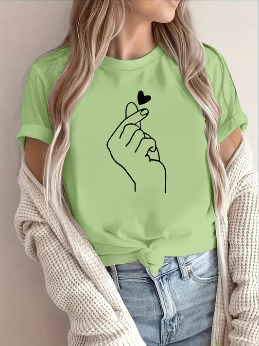 Finger Heart Print T-Shirt, Short Sleeve Crew Neck Casual Top For Summer & Spring, Women's Clothing