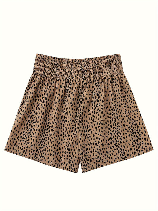 Women'S Summer Leopard Print Shorts, High-Waisted Stretch Casual Shirred Woven Polyester Hot Pants, Lightweight Breathable Fabric, 100% Polyester 100g/m²