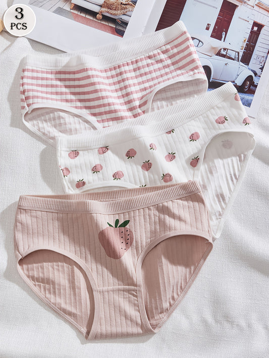 3pcs Cute Strawberry Women’s Briefs - Soft Ribbed Mid-Rise Underwear, Comfortable Elastic Waistband, Adorable Pink & White Designs with Strawberry Prints