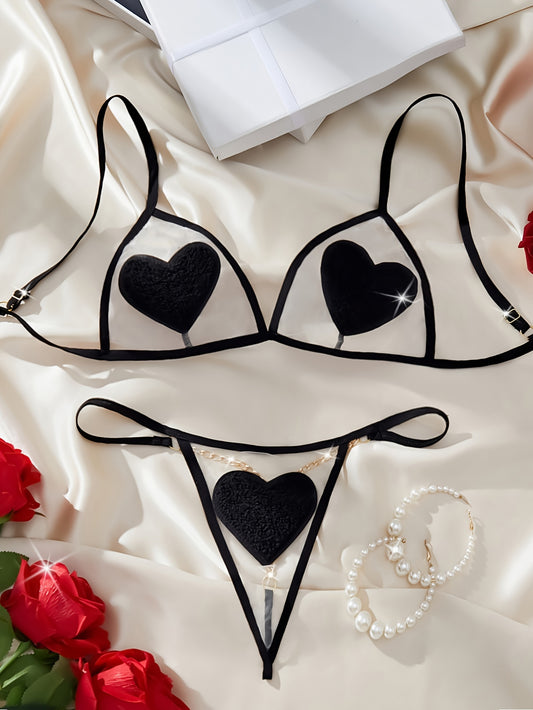 Mesh Heart Pattern Spaghetti Straps Lingerie Set, Intimates Bra & Thong, Women's Sexy Lingerie & Underwear