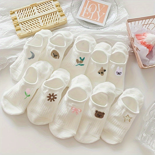 10pcs Cute Animal & Floral No-Show Socks for Women - Breathable, Soft Polyester Blend, Invisible Boat Socks with Non-Slip Heel, Perfect for Spring & Summer, Cute Socks