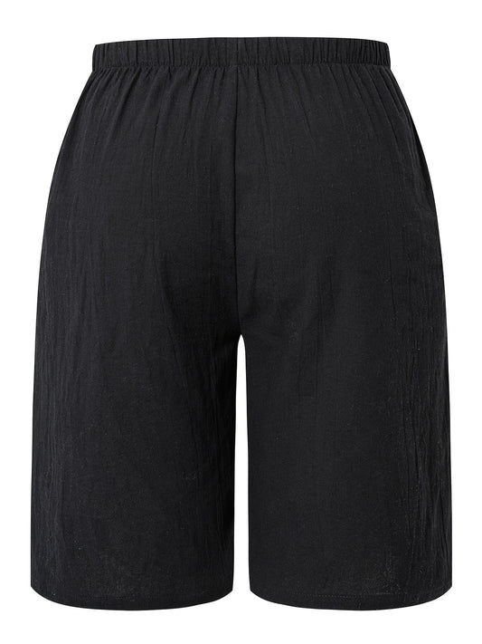 Women'S Casual Solid Color Shorts, 100% Polyester Woven Fabric, All-Season Beach Pants with Fake Drawstring, 126g/m² Weight - Black