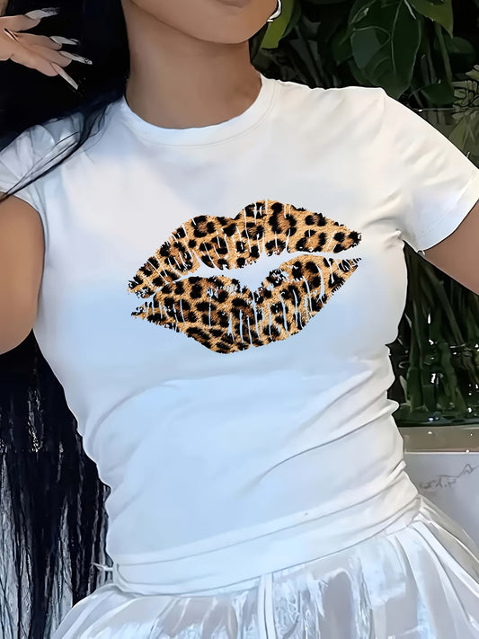 Leopard Lip Print Crew Neck T-shirt, Comfy Short Sleeve Casual Top For Summer & Spring, Women's Clothing