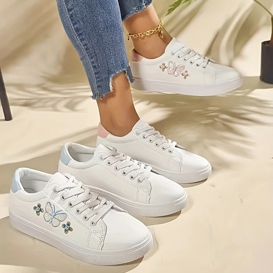 Ladies Butterfly Casual Sports Shoes, White Low-Top Lace-Up, Colorful Butterfly Pattern, Round Toe, Synthetic Upper, Plastic Sole, Non-Woven Fabric Insole and Inner Material, with Hand Wash or Professional Dry Clean Operation