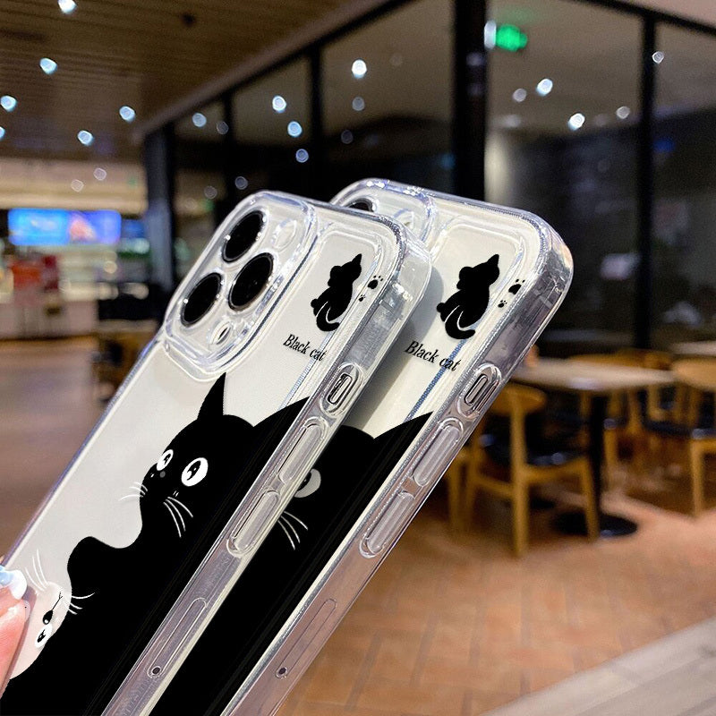 1pc Cartoon Cute Black Cat Space Phone Case for Iphone 16 15 14 13 12 11 Pro Max XS XR X 7 8 Plus SE 2022 Transparent Protective Case