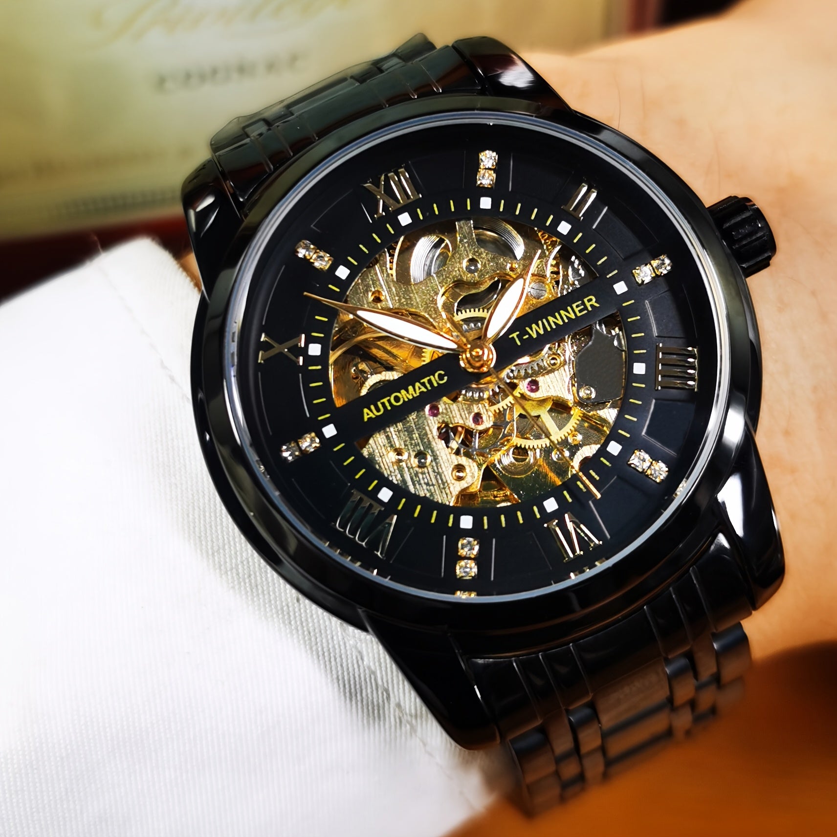 1pc Fashion Luxury Golden Skeleton Automatic Mechanical Watch for Men Luminous Hands Top Brand Stainless Steel Strap Business Casual Mens Watches Festival Birthday Gifts, TWINNER