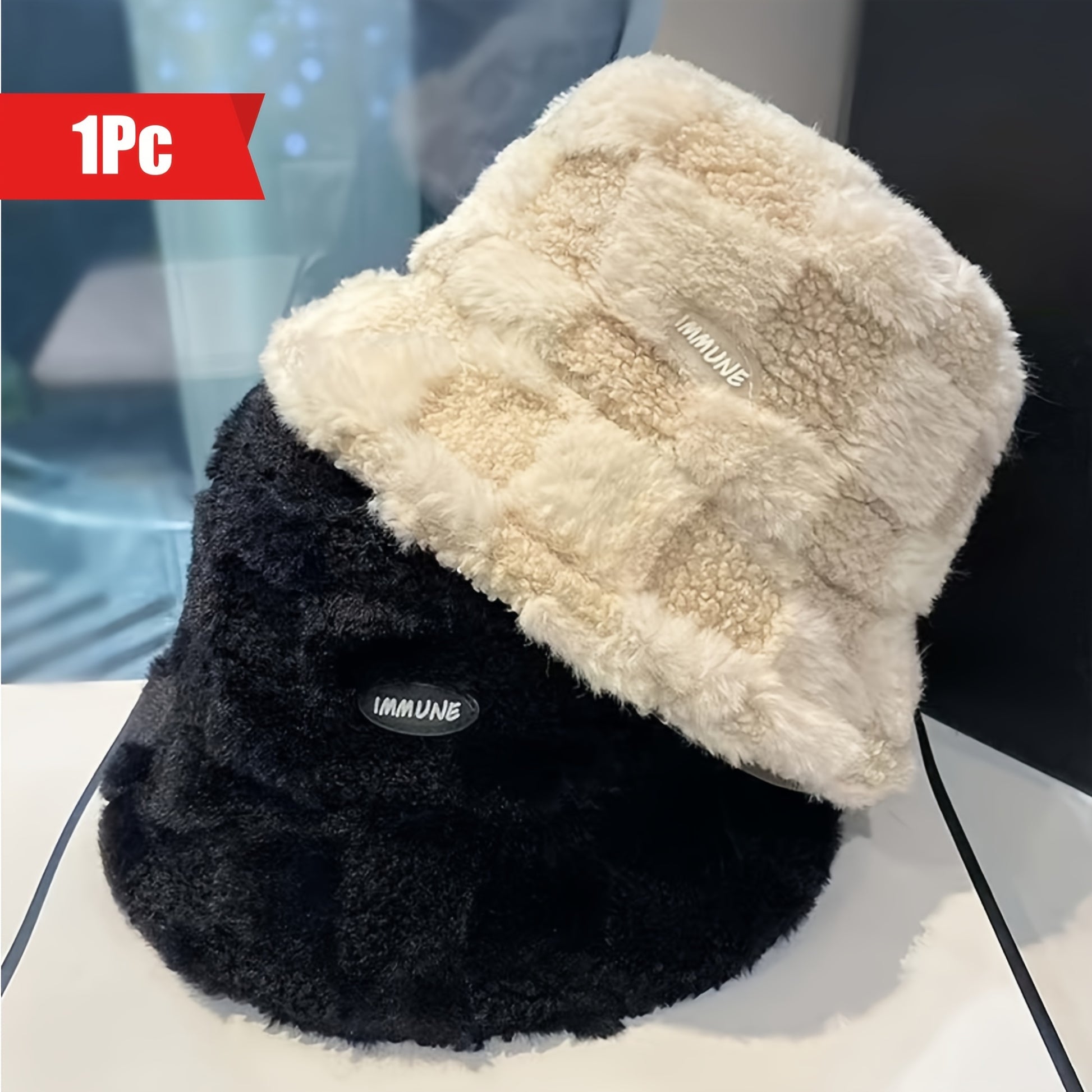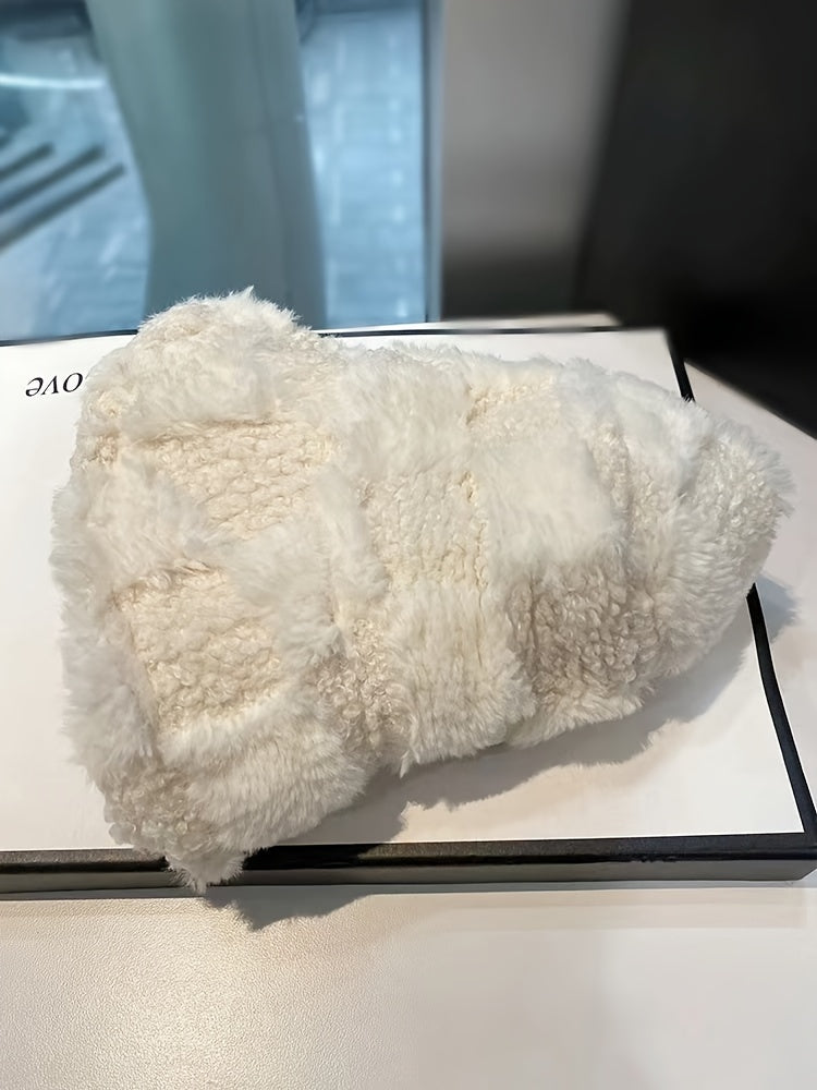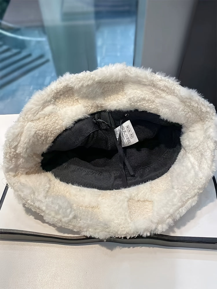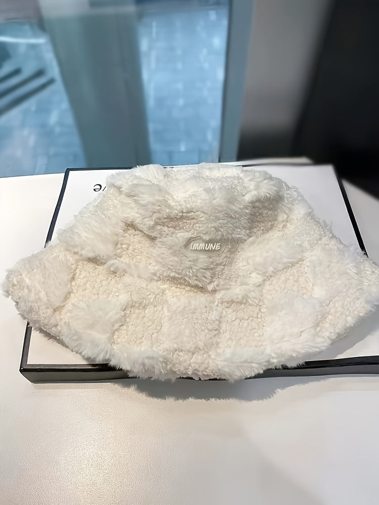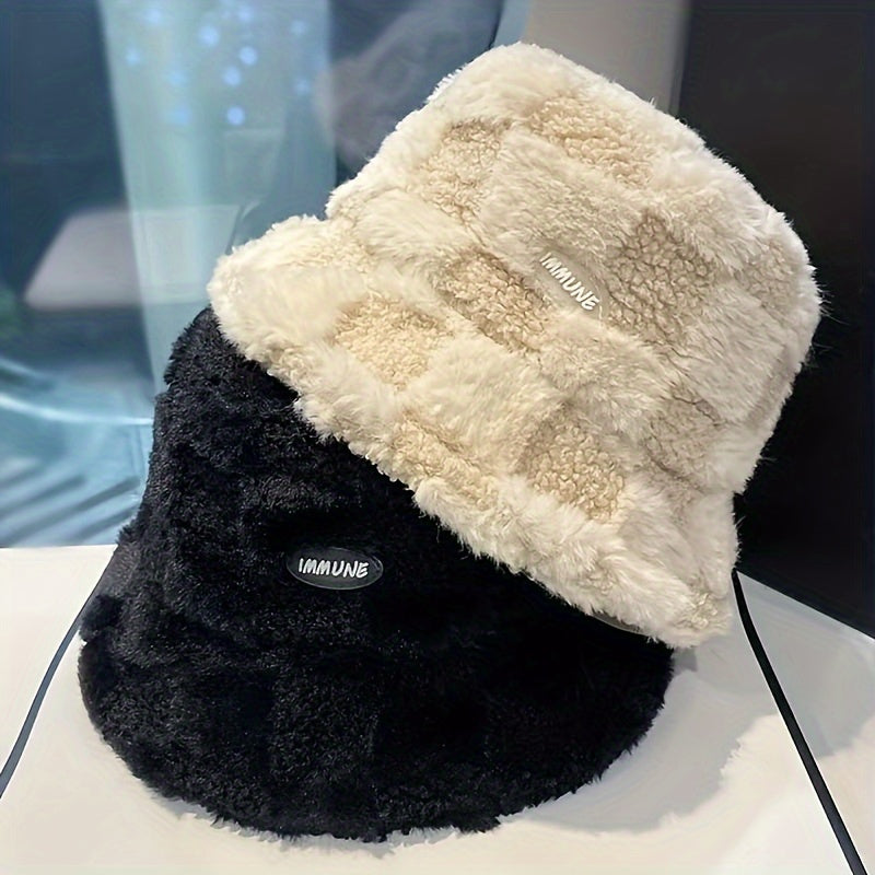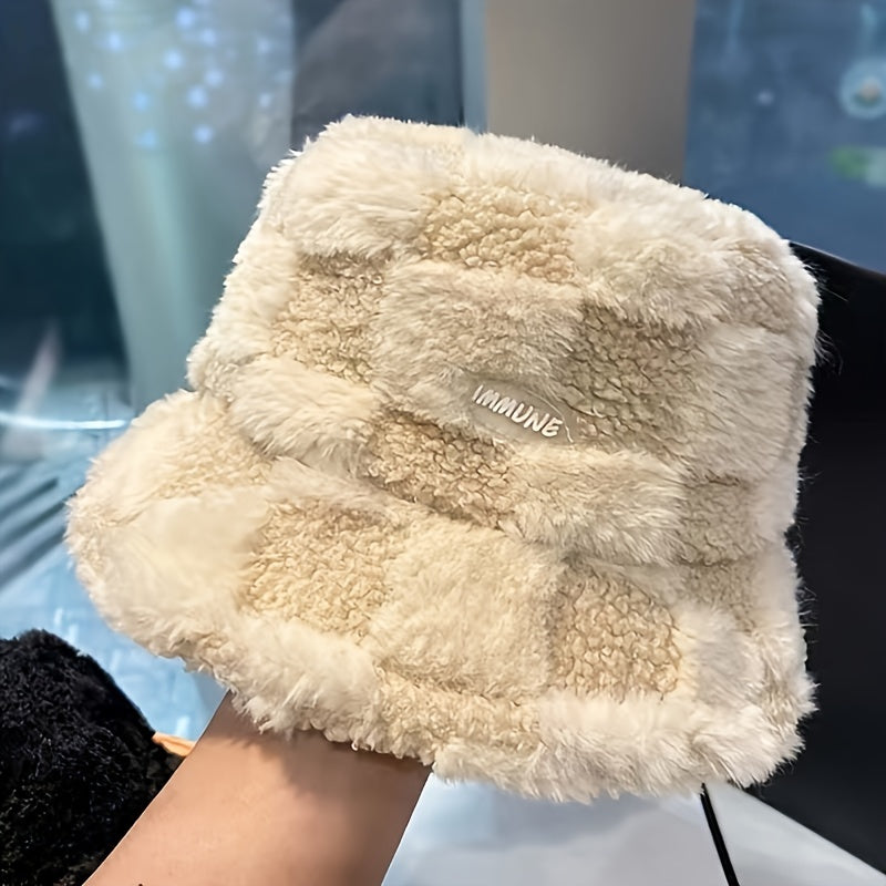 1pc Fashionable Unisex Winter Warmth Bucket Hat, Thickened Plush Polyester Fiber, Knitted Elastic Fabric, Cozy Plaid Fisherman Cap with Lettering
