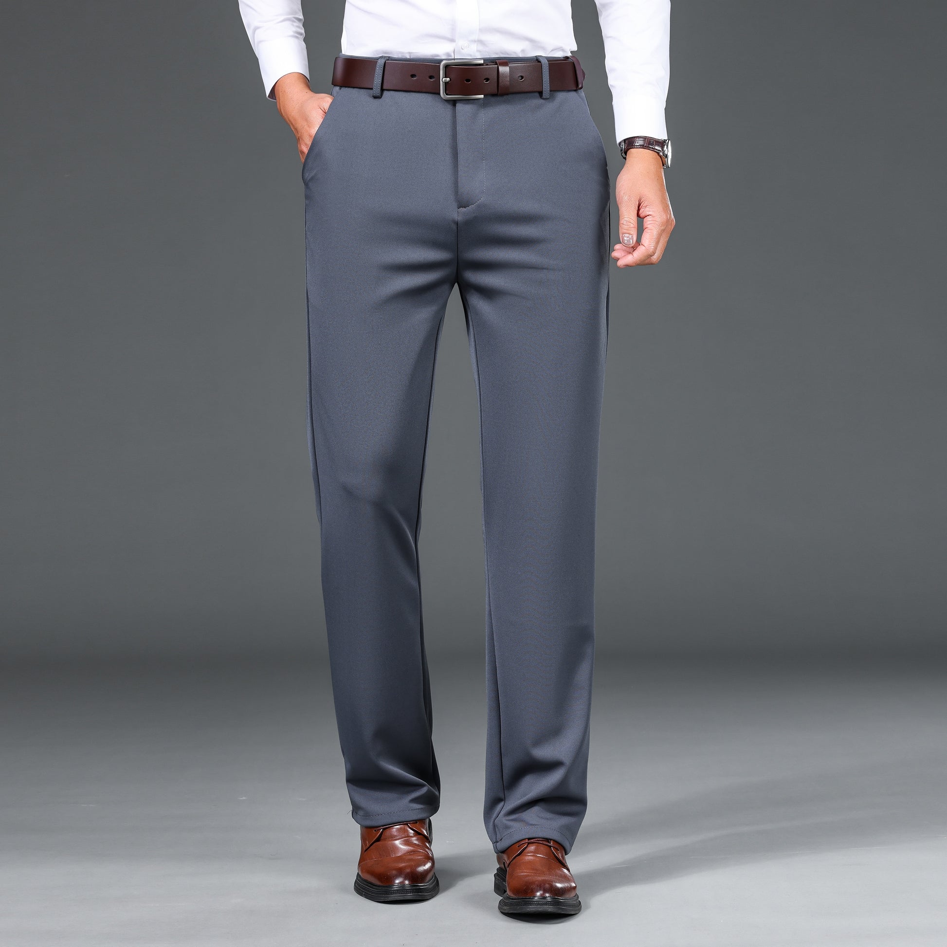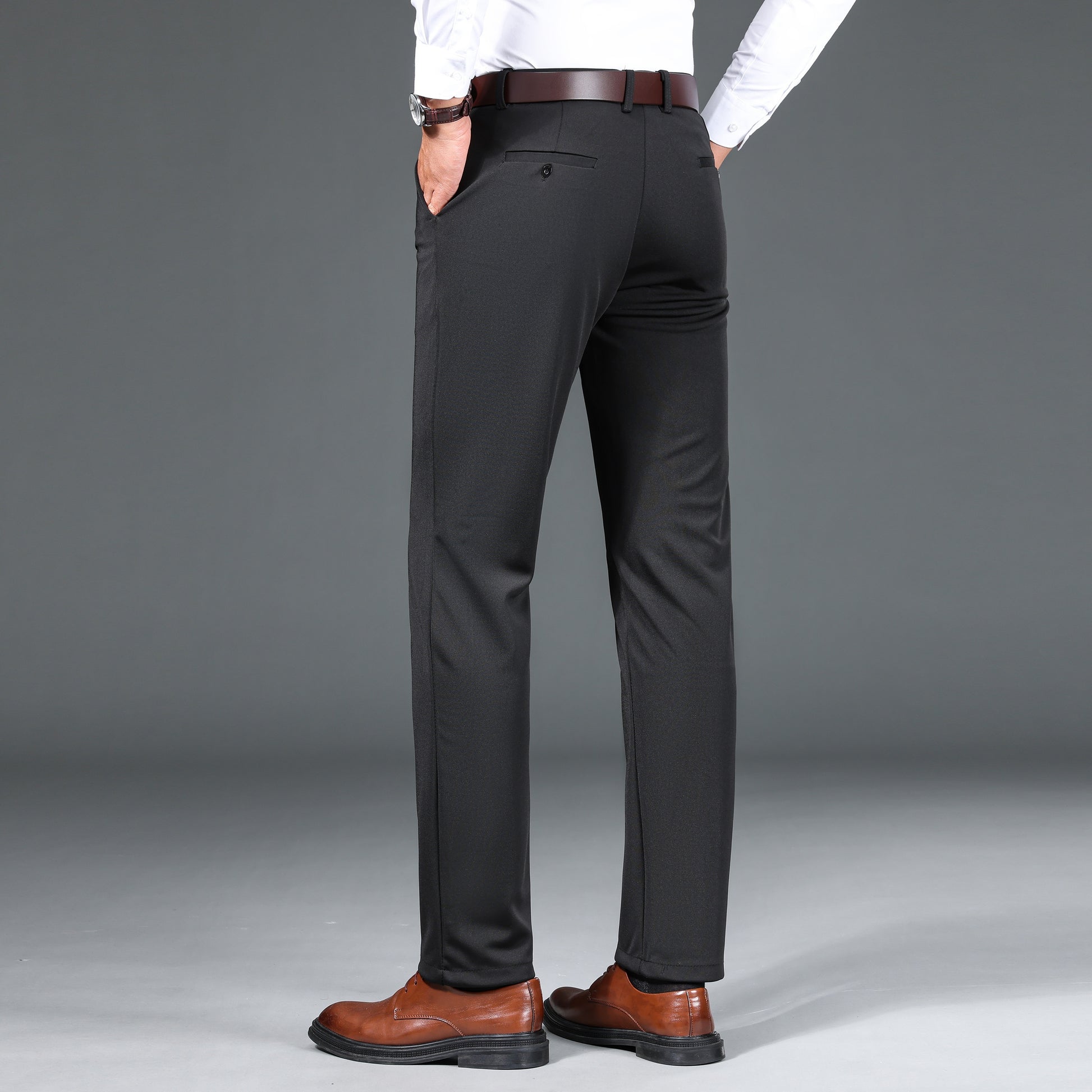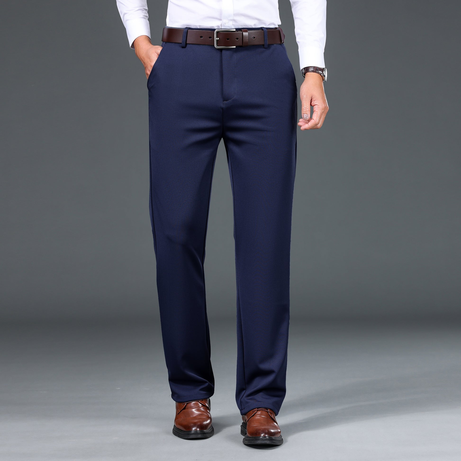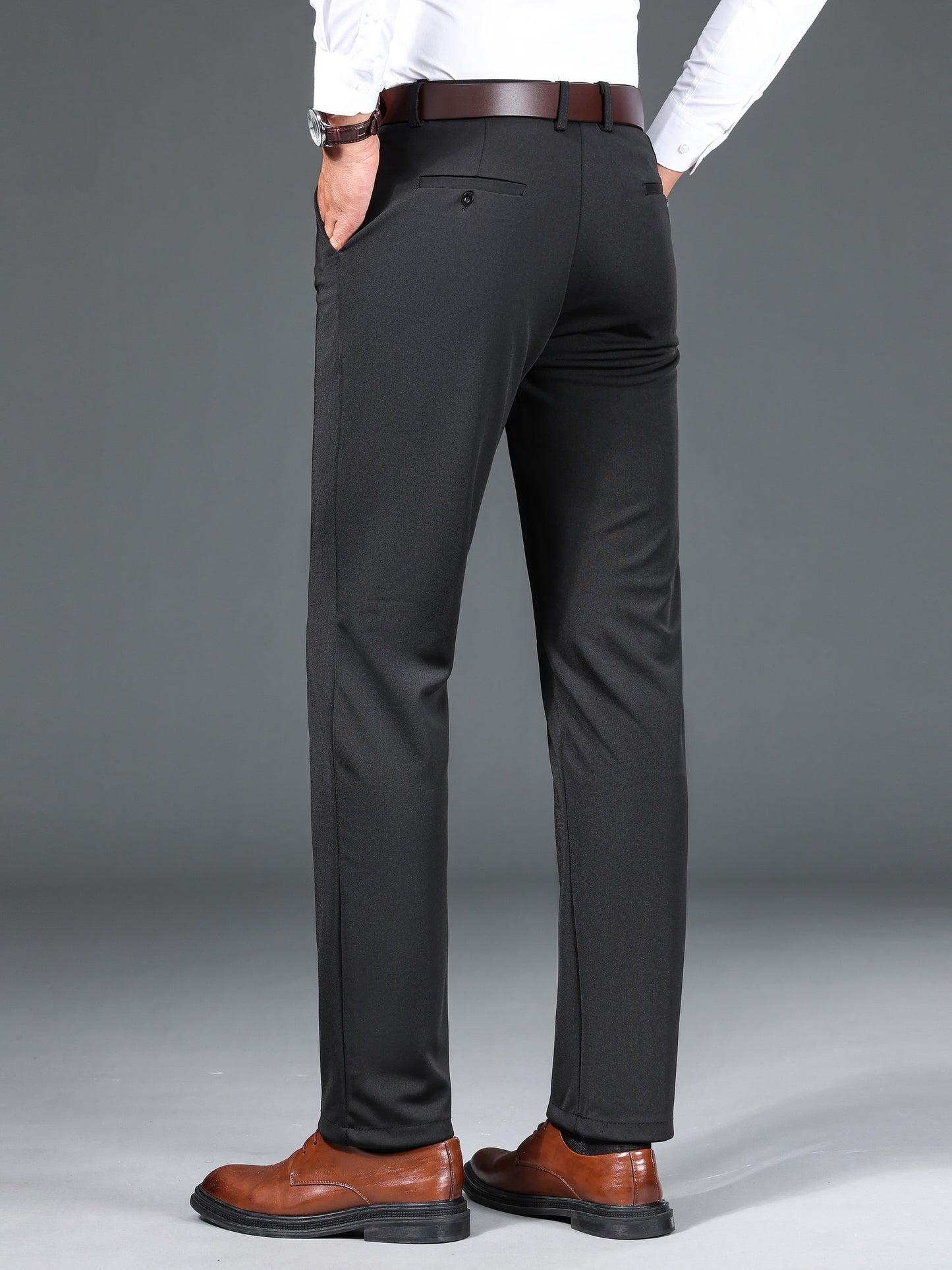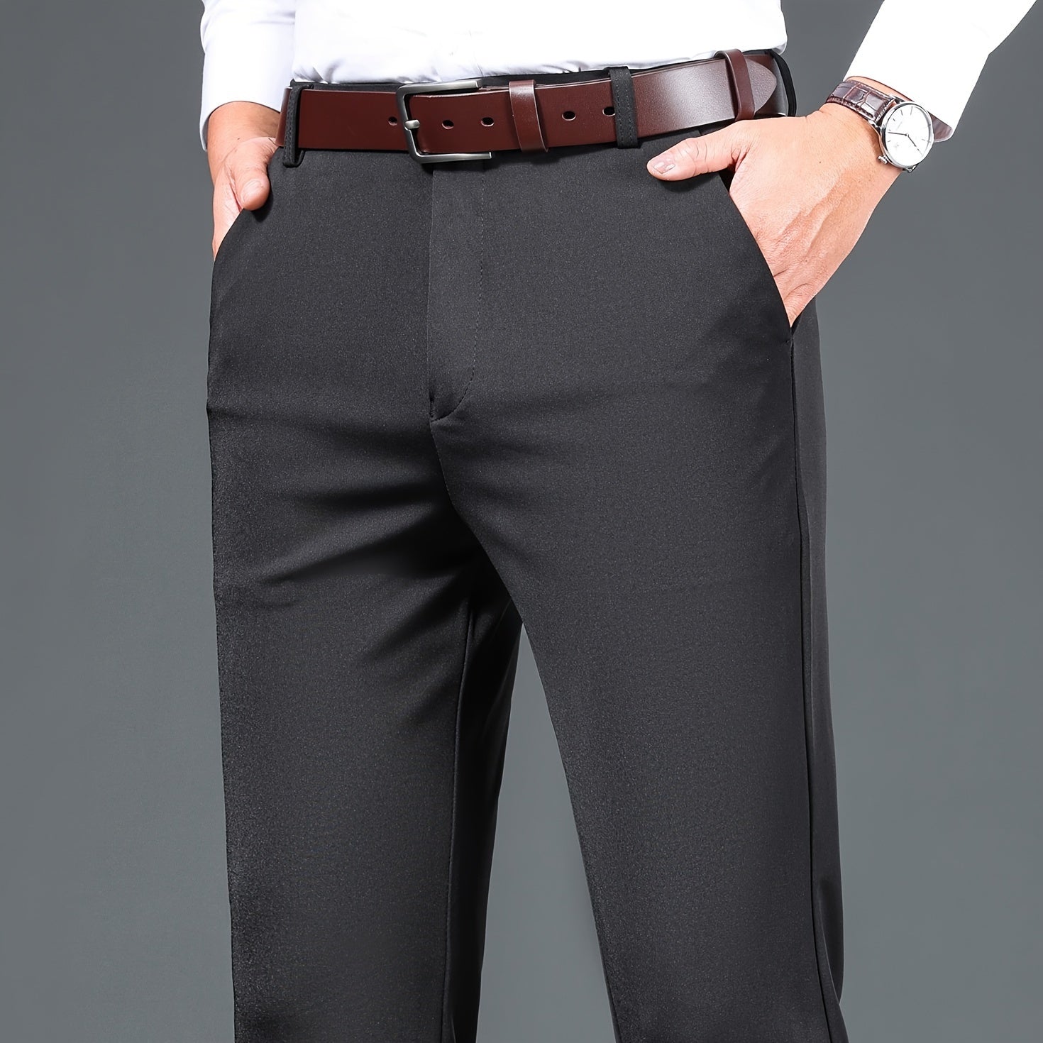 1pc Men'S Warmth Business Casual Pants, Fall/Winter Fleece-Lined Thickened Straight-Leg Trousers with Slant Pockets, Solid Color Knit Fabric Regular Fit Dress Pants with Zipper Closure, Medium Stretch Polyester
