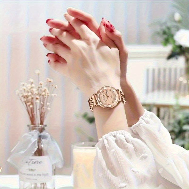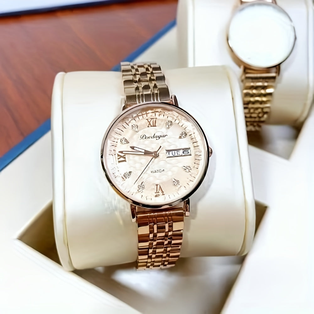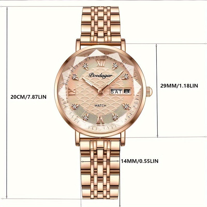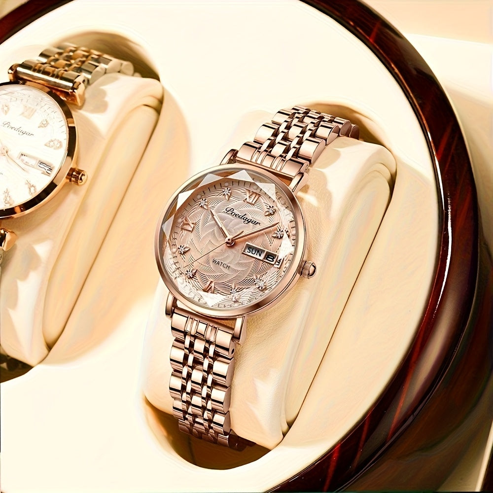 1pc POEDAGAR Elegant Women'S Quartz Watch - Luxurious Rose Golden-Tone with Luminous Hands, Calendar Display, Alloy Case & Band, Quartz Movement, Fashion Accessory|Elegant Timepiece|Rose Golden Finish, Watch Accessories
