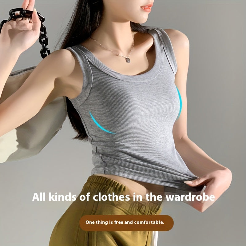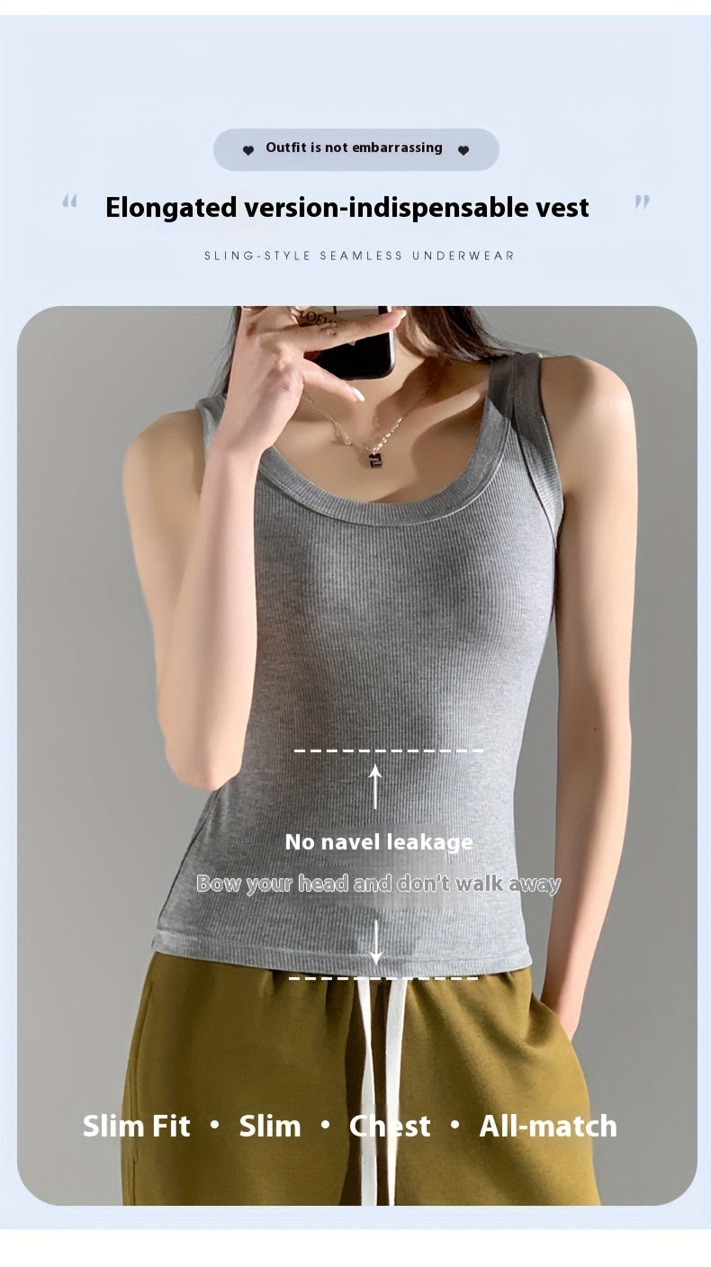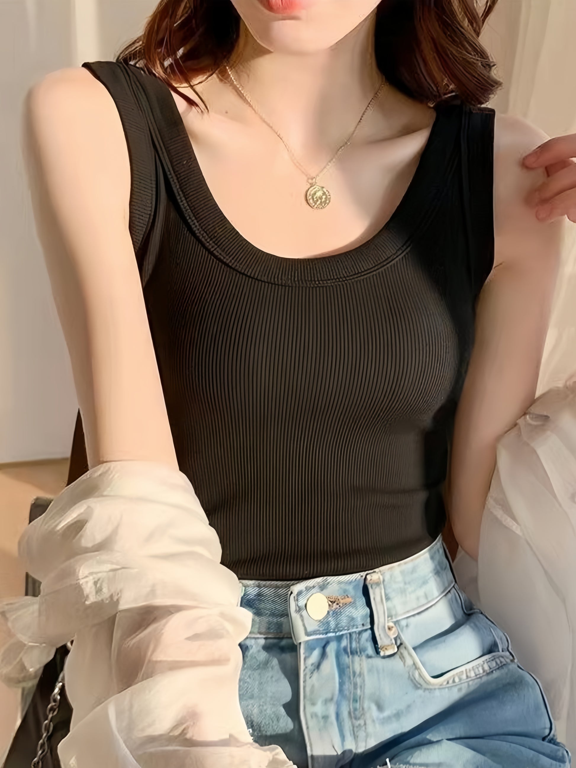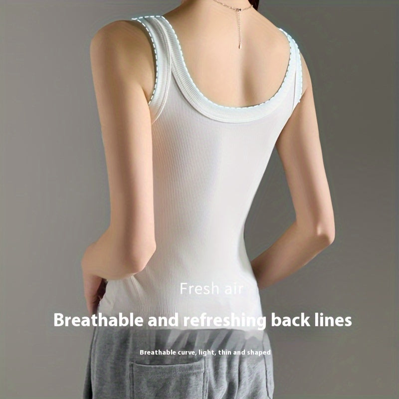 1pc Women'S Casual Ribbed Tank Top, Solid Color Knit Vest with Side Stripe Detail, Low Neck Polyester Camisole for All Seasons, Versatile Layering Piece
