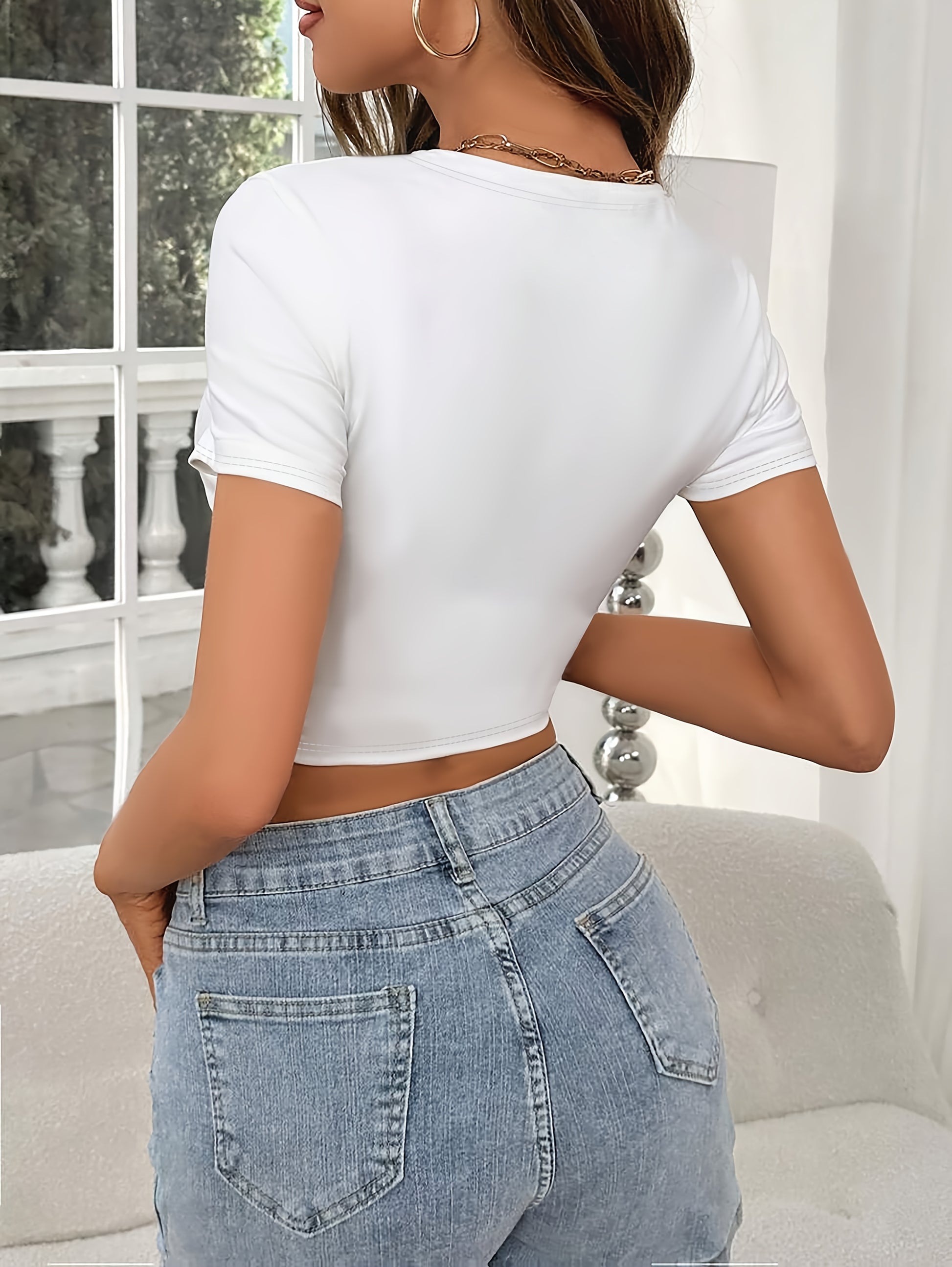 1pc Y2K Fashion Solid Color Crop Top T-Shirt, Women'S Short Sleeve Round Neck Knit Polyester Tee, Versatile All-Season Casual Wear