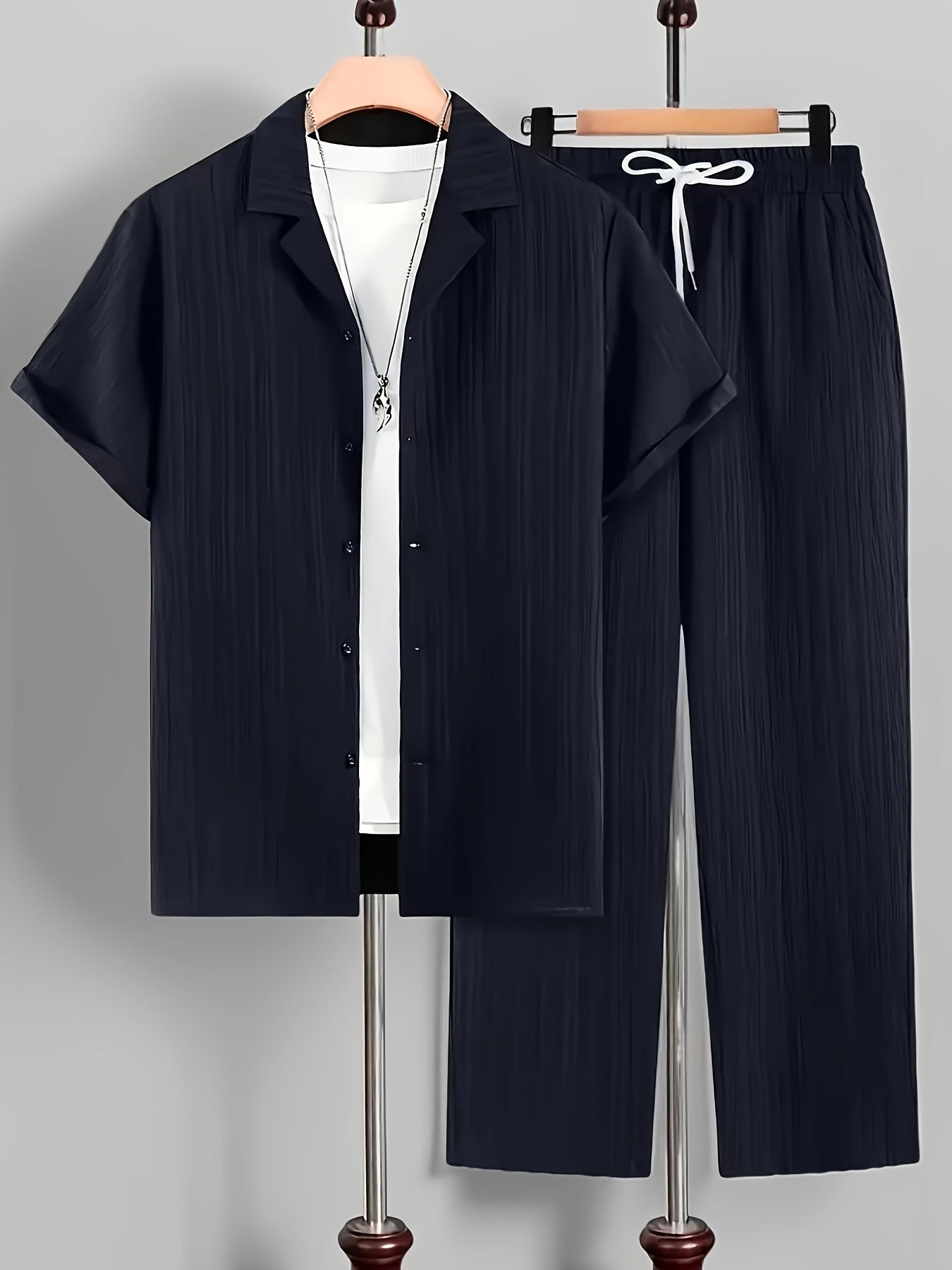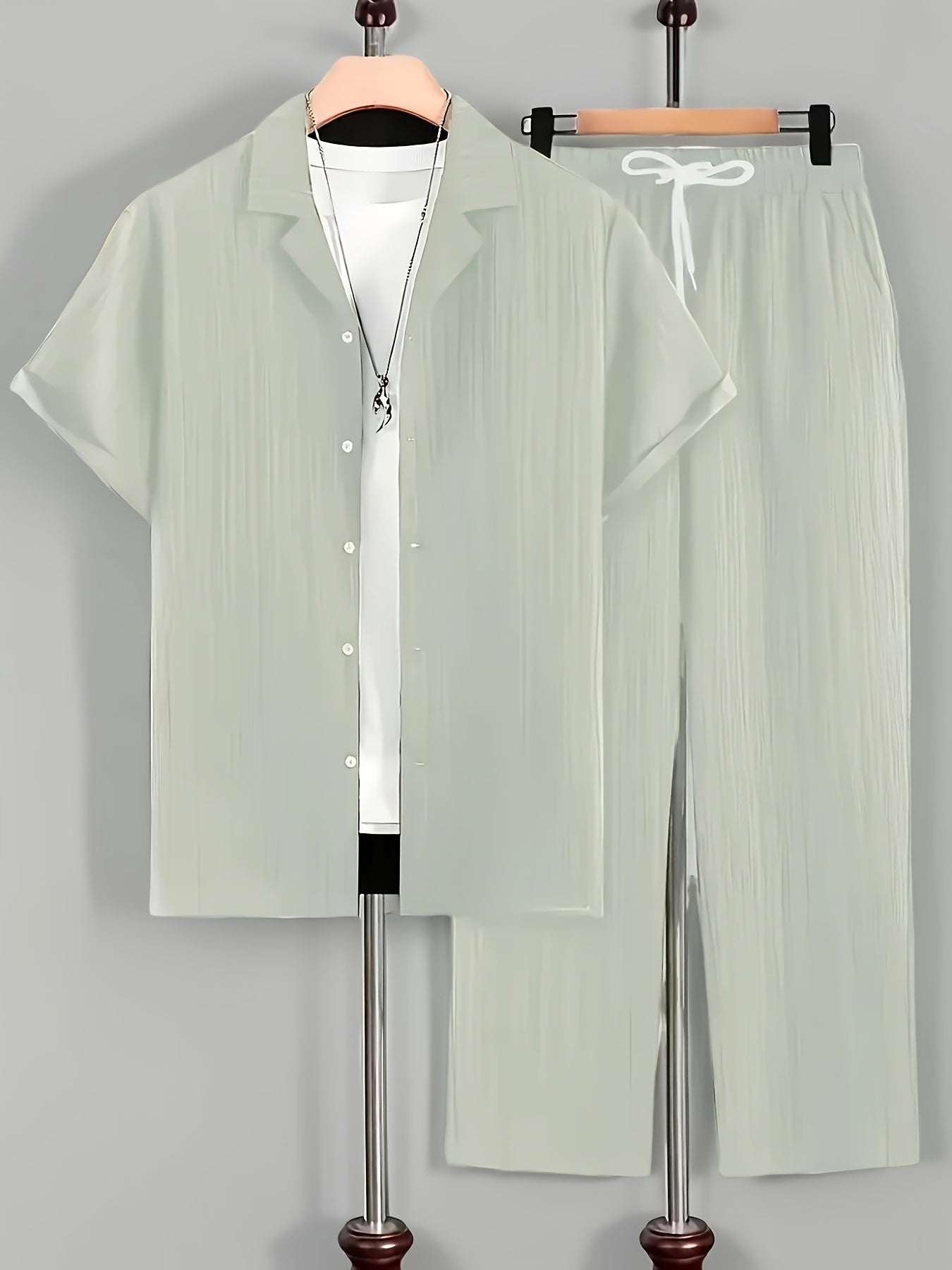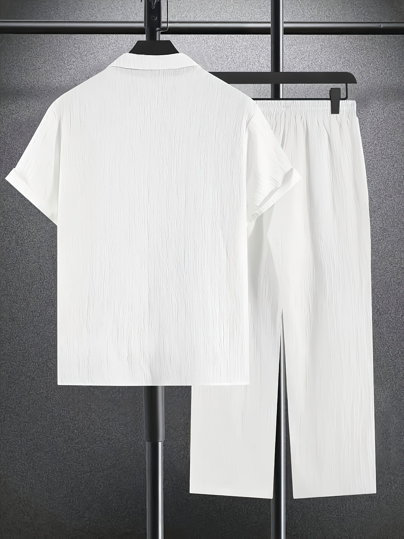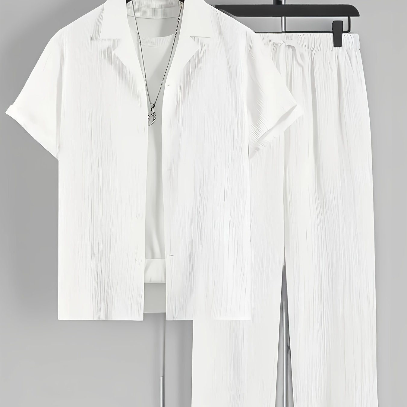2pcs Men'S Casual Summer Set - Short Sleeve Button-Up Cuban Collar Shirt and Drawstring Waist Pants, Polyester Blend, Solid Color, Regular Fit, Breathable Fabric, Lightweight for Daily Wear