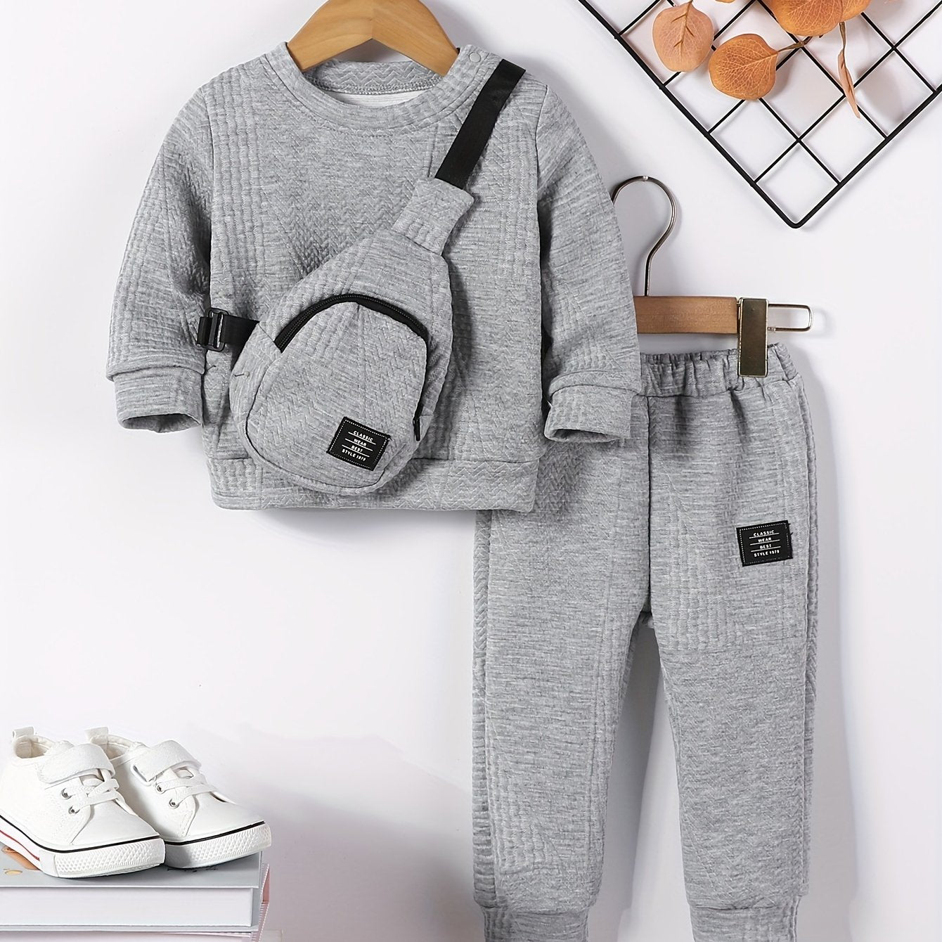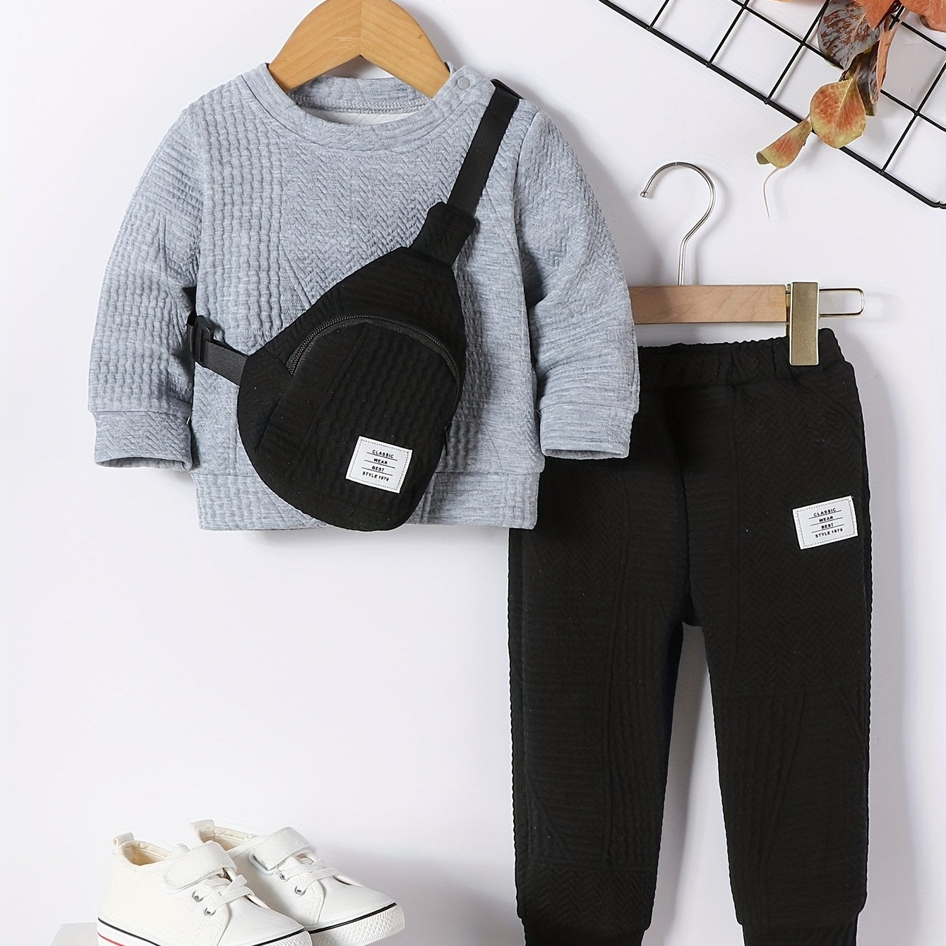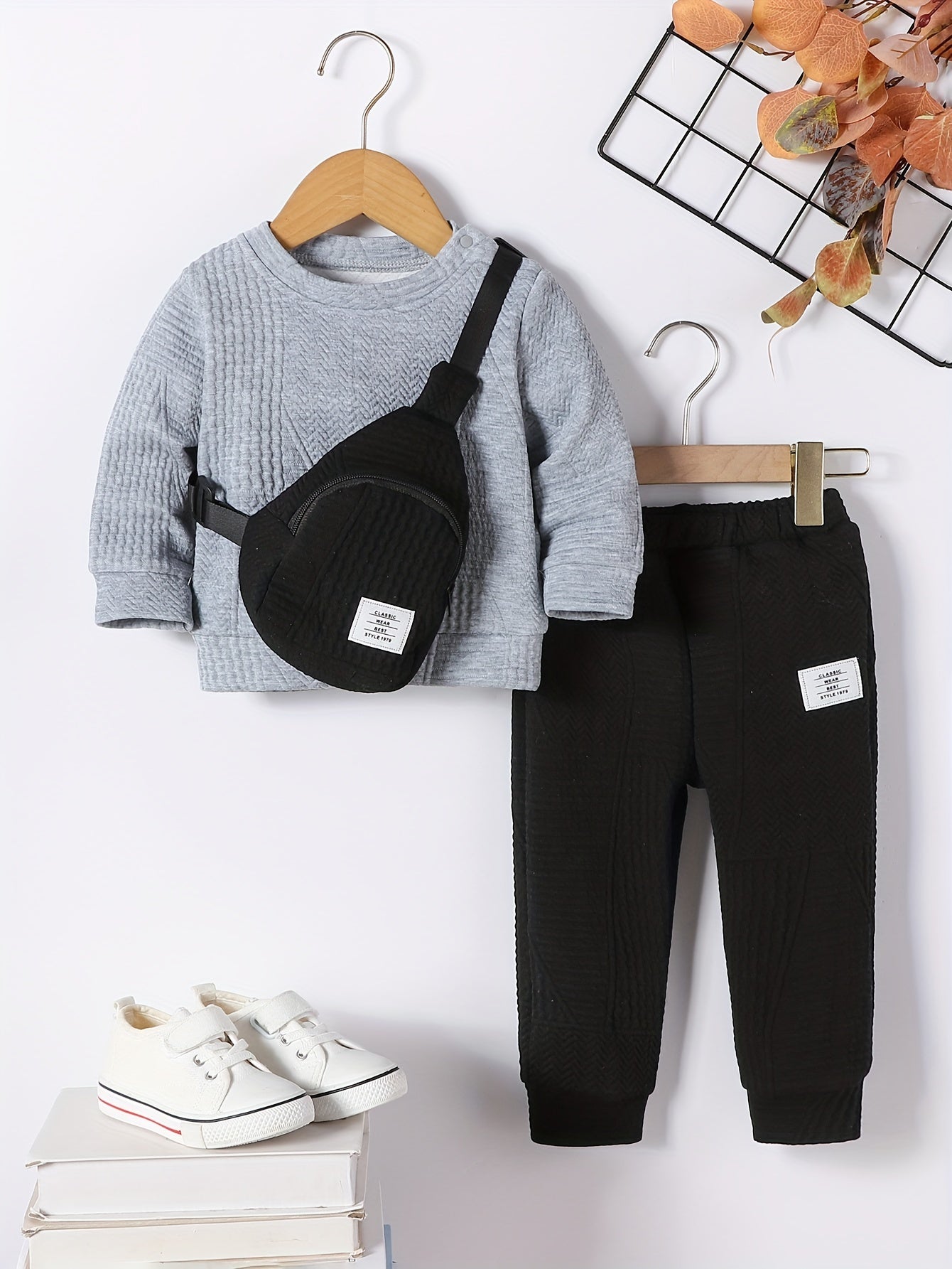 3pcs Set for Boys: New Autumn Shoulder Button Plain Round Neck Sweater, Trousers and Crossbody Bag, Casual and Fashionable Three-piece Set