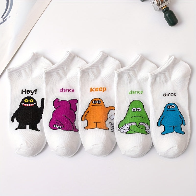 5pcs Cute Animal Cartoon No-Show Socks for Women - Soft Polyester Blend, Playful "HEY! DANCE!" "KEEP!" "EMOTIONS!" Designs, Machine Washable, Elegant Style, Funny Socks