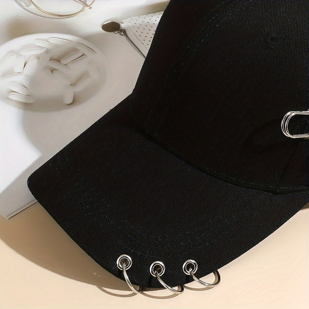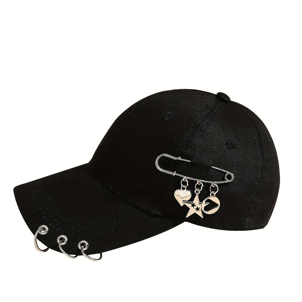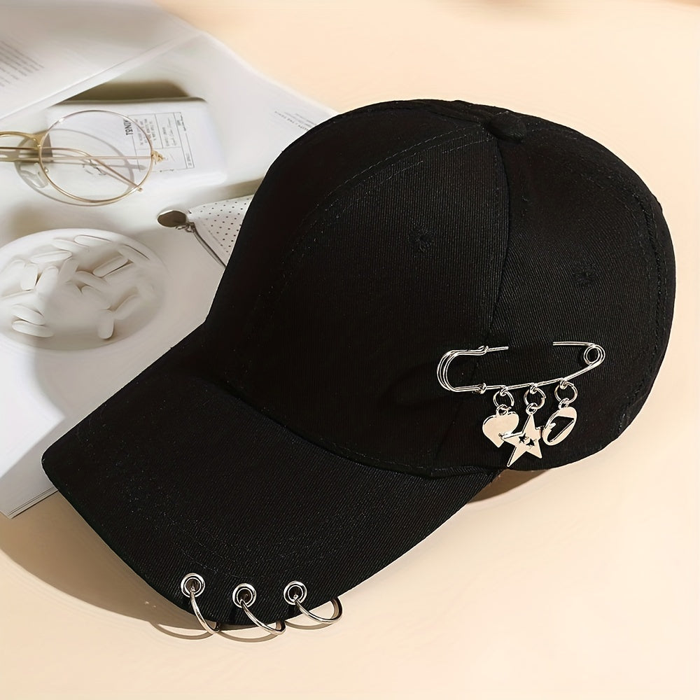 Adjustable Black Polyester Baseball Cap for Women - Trendy Korean Style with Heart & Star Pin, Versatile Fashion Accessory for Spring/Summer, Baseball Cap